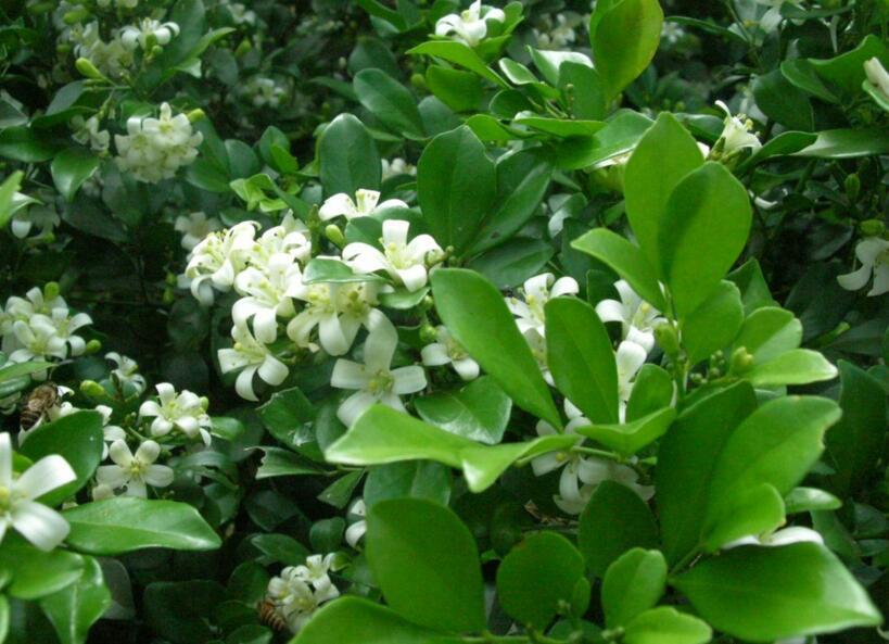 九里香,又叫千里香,葉片小而密集,呈深綠色有光澤。九里香的花潔白素雅,濃香撲鼻。每至秋季,白色小花開(kāi)滿枝頭,清香襲人,十分幽雅。